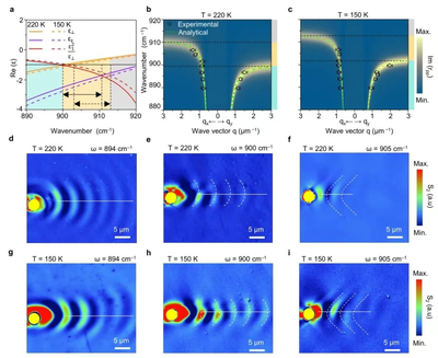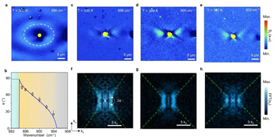 为验证这一发现,研究团队通过散射型近场光学显微镜(s-SNOM)在 895–905 cm⁻¹ 频段直接观测到了双曲波前(图3 c-e),且其开口角 α 随频率增大而减小(898cm⁻¹ 时 α=51°,902cm⁻¹ 时 α=33°),为非双曲材料中存在双曲极化激元提供了确凿的实验证据。